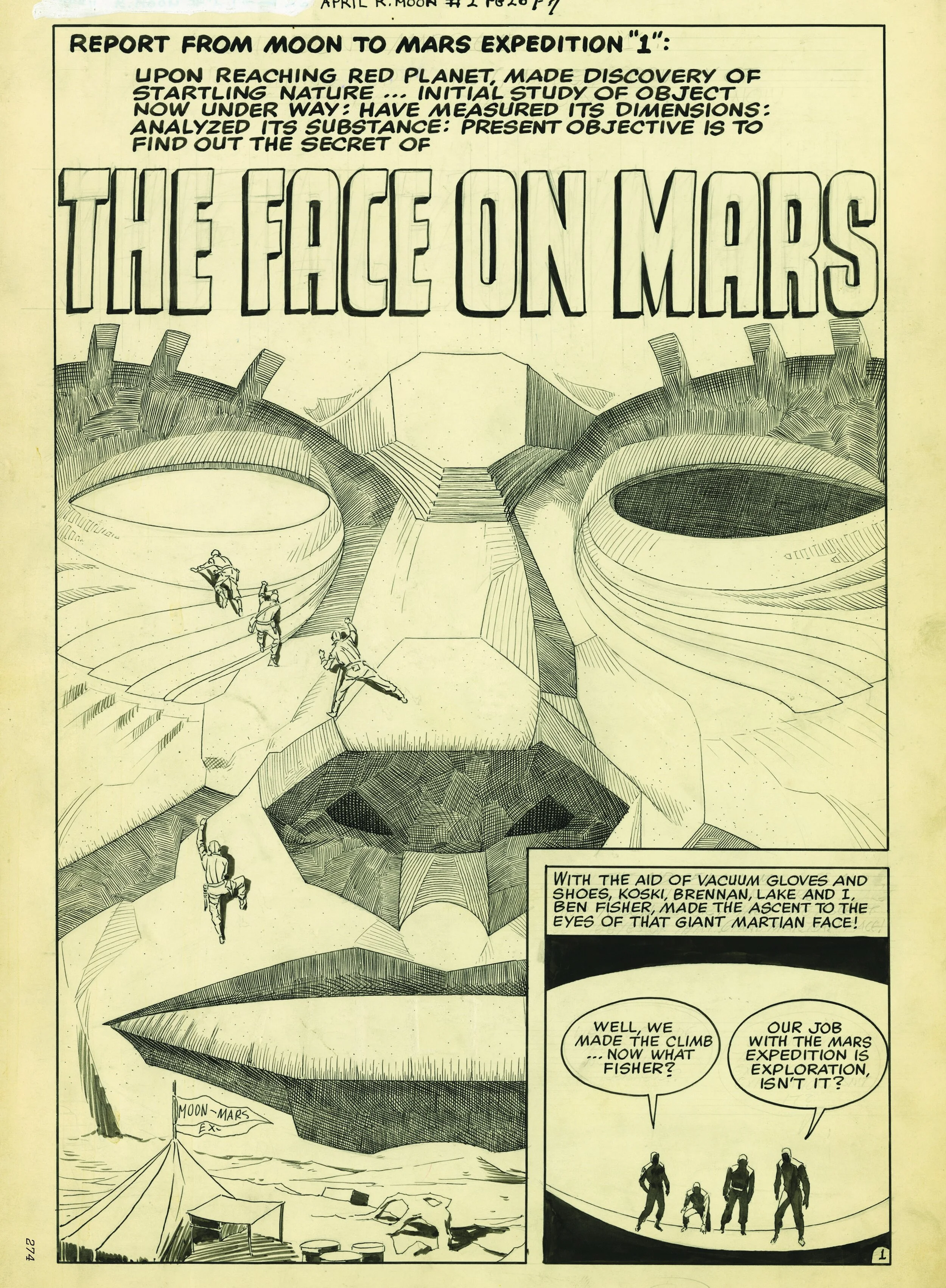 The Art of the Simon and Kirby Studio by Joe Simon and Jack Kirby. Selected and with an introduction by Mark Evanier; Afterword by Jim Simon. Published by Abrams ComicArts. All images are copyright the Estates of Joseph H. Simon and Jack Kirby. Fighting American no. 1 (April 1954). Prize Comics. “Duel to the Finish Line!” illustrated by Jack Kirby. Race for the Moon no. 2 (September 1958). Harvey Comics. “The Face on Mars” illustrated by Jack Kirby and Al Williamson. Foxhole no. 2 (December 1954). Mainline Publications. “Hot Box” illustrated by Jack Kirby.